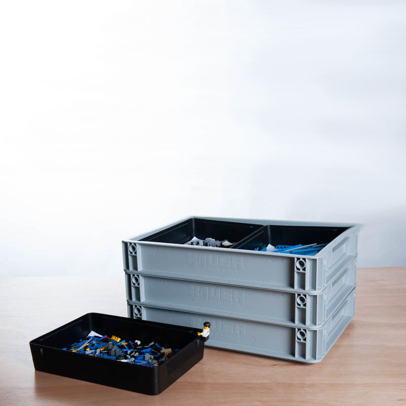 Een set bestaat uit 3 grijze bakken van 30×40 cm met daarin twee zwarte bakjes van ca 30×20 cm.